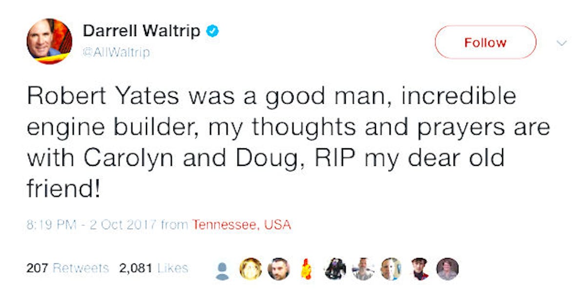 “Our sport lost one of the most inventive minds and kindest personalities in Robert Yates,” champion driver Tony Stewart told ESPN. “I’m glad I got to know him and proud our race team was able to honor him this year at Darlington.”