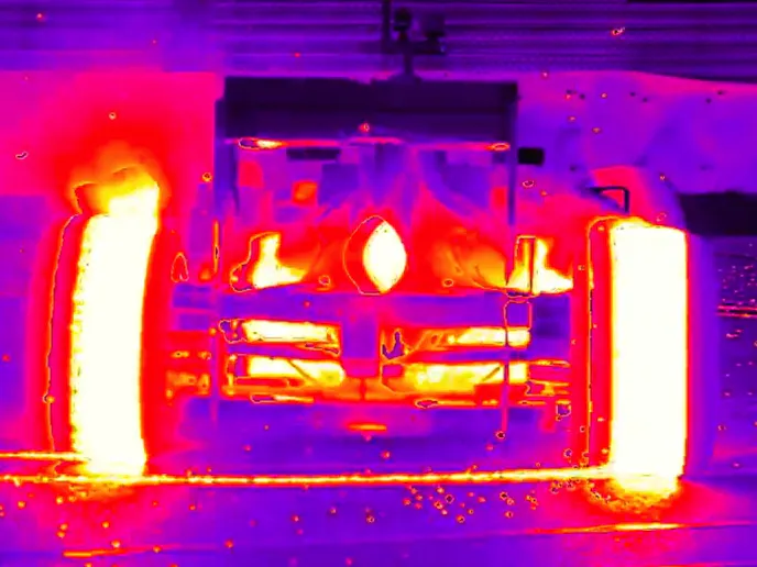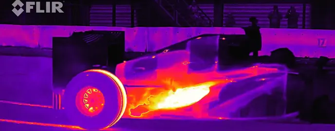 FLIR, a company that builds thermal imaging cameras and is a partner with Infiniti Red Bull Racing, just released a video that shows the heat signatures from the engine and tires during a burnout with a Formula 1 car.