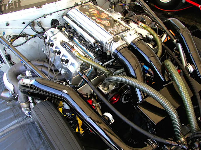 The turbo system is a little unique, starting with the Precision Turbos that feature a one-piece, forged aluminum center housing and compressor backplate assembly along with a stainless-steel turbine housing. They’re mounted to 2.25-inch diameter headers fabricated by Bill Hickock, who also serves as the car’s crew chief, out of materials from Doug’s Headers. Boost is manipulated with TiAL wastegates before the pressurized air is routed through an Ed Thornton-built air-to-water intecooler — but no water is routed through the intercooler.