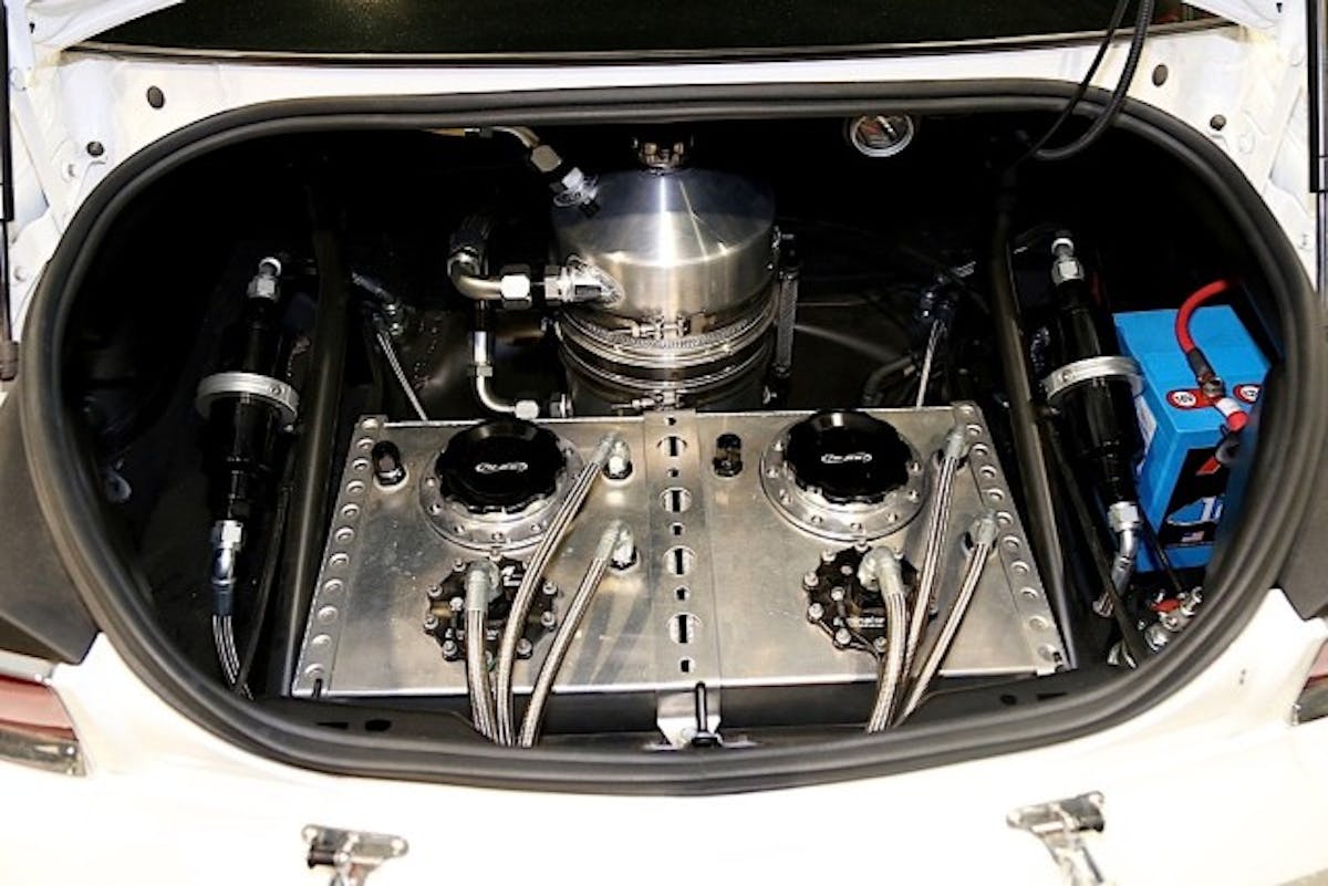 The fuel system is set up for complete computer control with optional input by the driver. First, there are two injectors per intake runner. Normally this setup is NRE’s Octane on Demand system for the street. Light-duty driving can get by with pump gas but when the the engine is treated to WOT, an auxiliary tank with race gas kicks in. For this application–where the goal is to accelerate from 0 to well beyond 200 mph within the span of 5,280 feet–the twin tanks are both stocked with high-octane race gas.