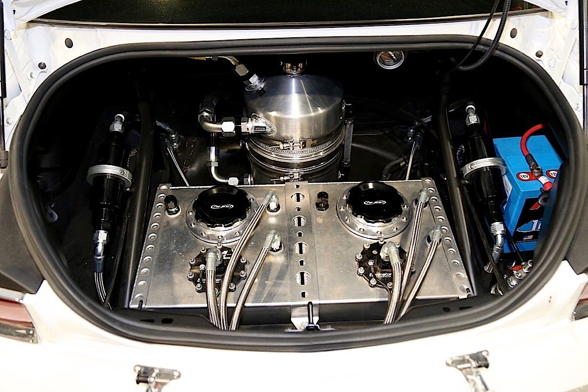 The fuel system is set up for complete computer control with optional input by the driver. First, there are two injectors per intake runner. Normally this setup is NRE’s Octane on Demand system for the street. Light-duty driving can get by with pump gas but when the the engine is treated to WOT, an auxiliary tank with race gas kicks in. For this application–where the goal is to accelerate from 0 to well beyond 200 mph within the span of 5,280 feet–the twin tanks are both stocked with high-octane race gas.