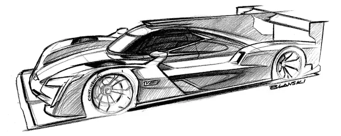 ECR engine designers had to fit the power plant within the Cadillac cues developed for the Dallara chassis. This sketch came from Cadillac lead creative designer Dillon Blanski. The design details giving the DPi-V.R car its distinctive Cadillac appearance and presence include the vertical lighting signature; the sheer, sculptural quality of the body and bold bodyside feature line, V-Performance wheels with Brembo brakes, V-Performance emblems and a canopy graphic inspired by the Cadillac daylight opening.