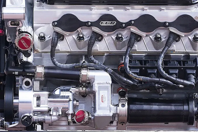 The LT block sports a bore slightly under stock dimensions. The rotating assembly features a fully counterweighted Bryant crankshaft, Carrillo steel H-beam connecting rods and Mahle pistons wrapped with Total Seal rings. The dry-sump lubrication system was designed along with Precision Racing Components.