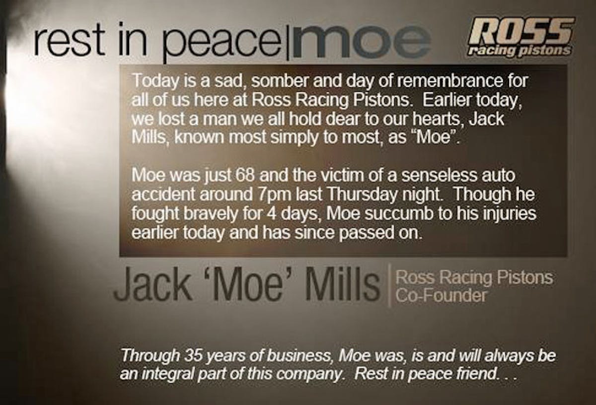 Funeral services for Jack “Moe” Mills, 68, who along with Ken Roble founded Ross Racing Pistons in 1979, will be held Thursday, January 8, in El Segundo, California, where the company is located.