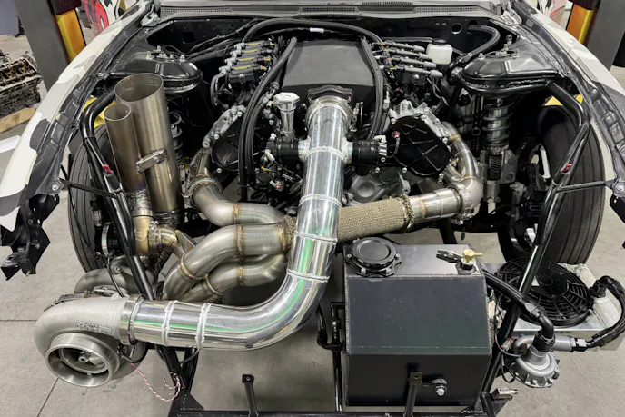 The 5.6-liter V8 has very thick cylinder sleeves, giving it a lot of added strength. Some Nissan enthusiasts liken the VK56VD to an LS with dual-overhead cams, but realistically, not even the very best production LS can touch the power this Nissan unit can produce. Jon Roger’s VK56 makes over 1,900 horsepower to the rear wheels on 43 psi of boost. While that is crazy street horsepower, it is not uncommon on the strip. What makes the Nissan V8 different is that it does this on the stock block and crank. In fact, the long block is almost entirely stock.