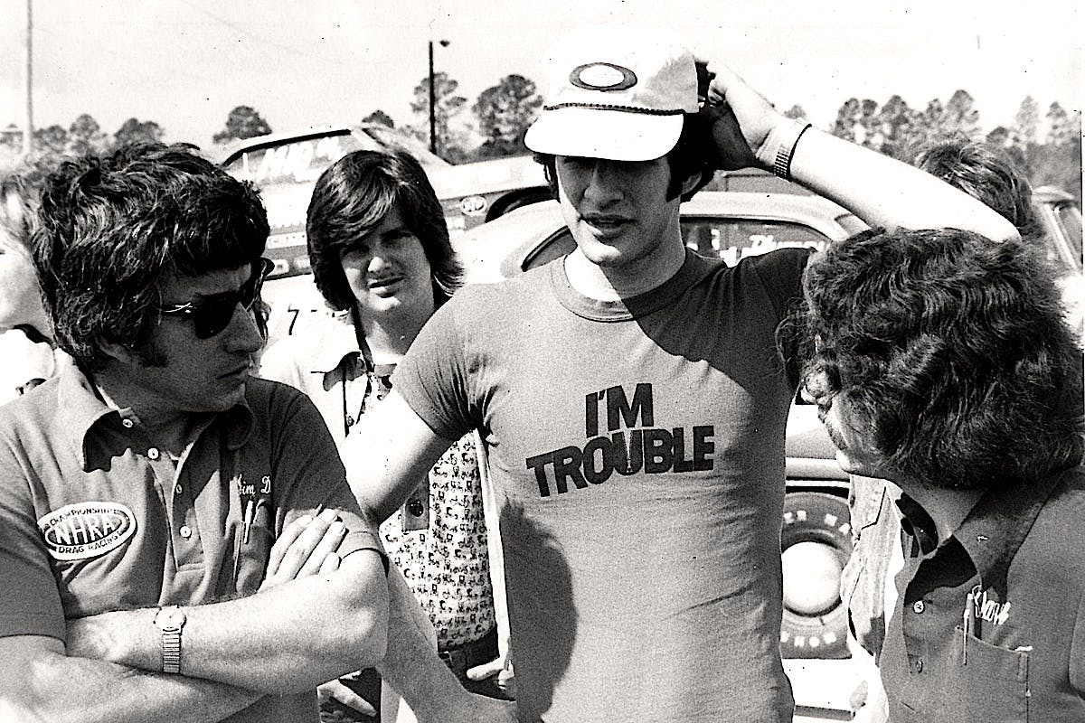 Always colorful as well as gracious, the Lepone legend is sprinkled with lively outbursts and heated debates about the sport. He proudly posted a photo from his first national race at Gainesville in 1970 on his Facebook page showing him arguing with an NHRA official over the classification of his car. At the time he’s wearing a T-shirt boasting “I’m trouble.”