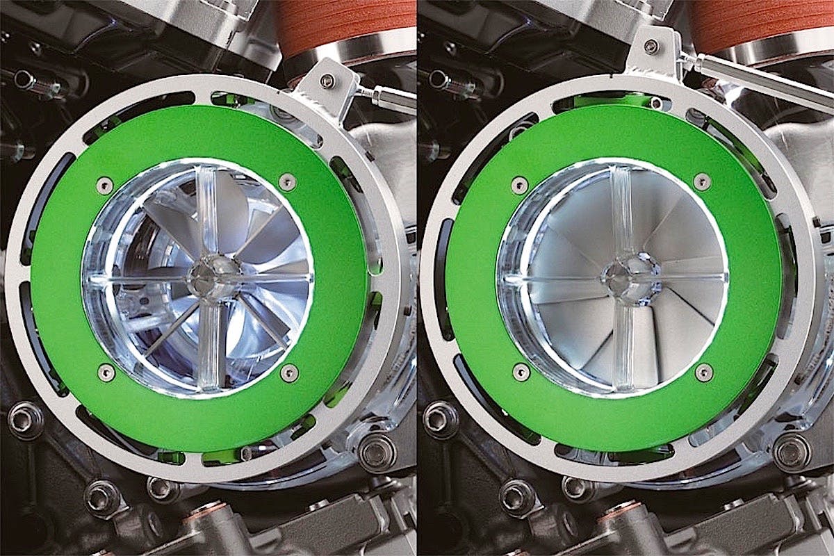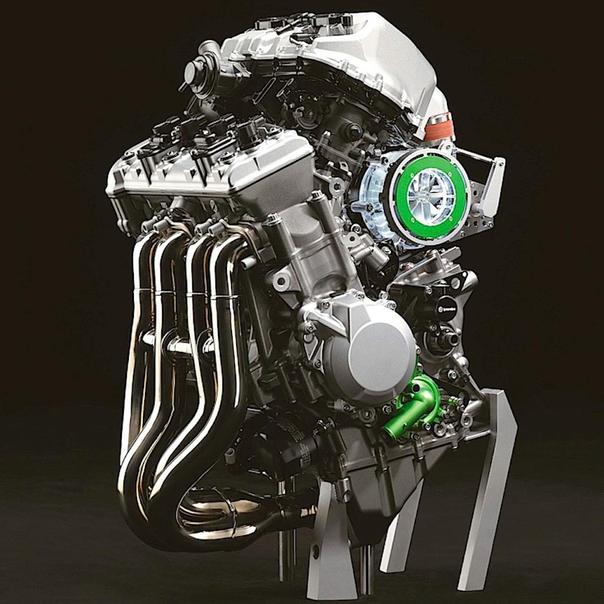 The $50,000, track-only H2R features a gear-driven, centrifugal-style supercharger provides up to 20 pounds of boost to the 998cc inline-4. The over-square cylinders (76 x 55 mm) are fed through individual 50mm throttle bodies with dual injection. The engine is rated at 300 horsepower.