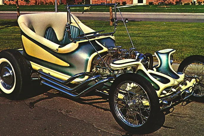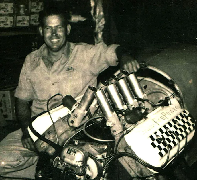 Along the way he opened his own garage in Maywood, California. Never one to turn down a friend’s request, he even built the engine that powers Ed “Bid Daddy” Roth’s famed Outlaw custom car. That cool Caddy V8 sports four Stromberg 97s and dressed up with plenty of chrome and fins.