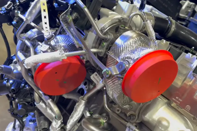 On the HurriCrate Cat 3 engine, the compression ratio sits at 10.4:1, with 22psi of boost on top, while the Cat 3 lowers the compression ratio to 9.5:1 but ingests 26 psi from the twin Garrett turbochargers. Those turbochargers are fed from dual water-cooled exhaust manifolds and feed their boost through an engine-mounted air-to-water charge cooler. Fuel comes via direct injection into the cylinders, while the dual overhead camshafts control the valves and manage the flow of gasses into and out of the engine.
