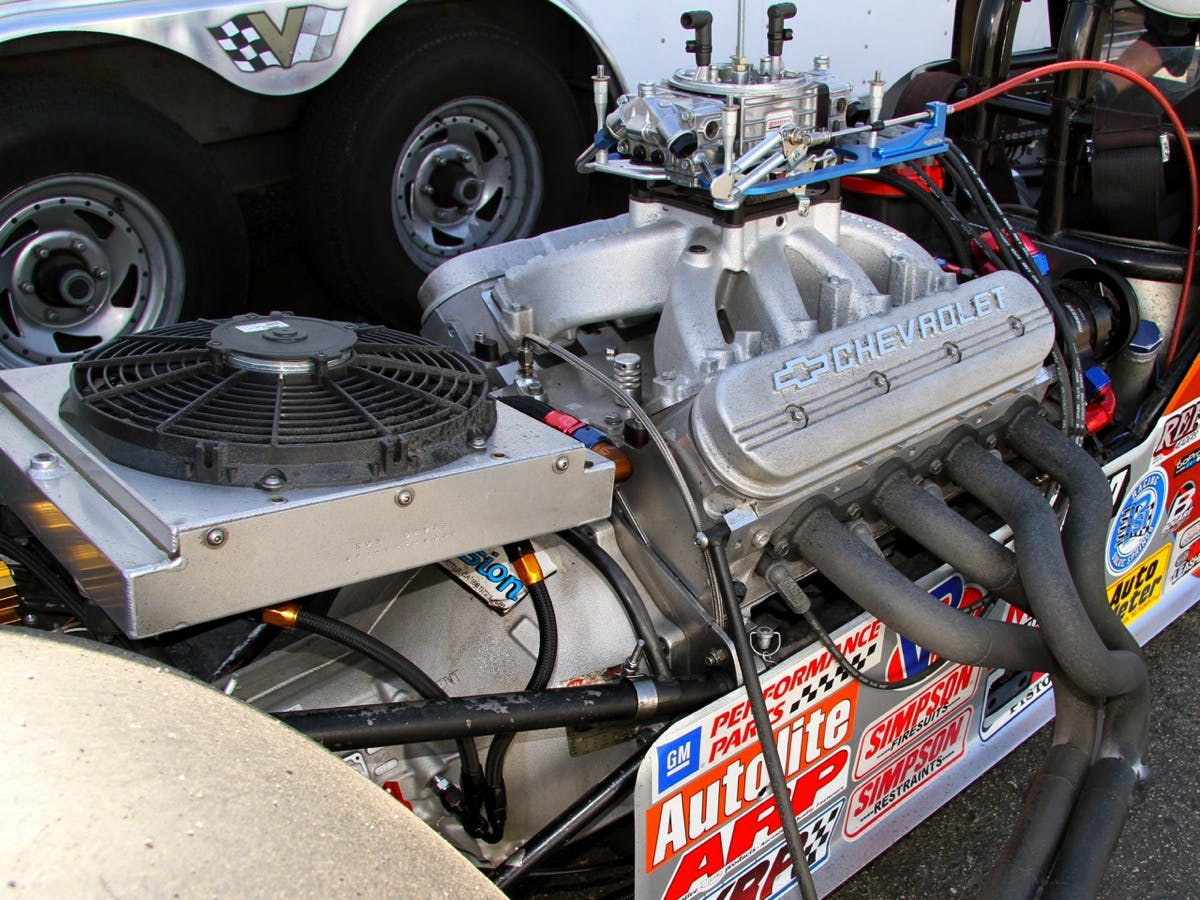 The foundation is a 6.0-liter block equipped with a Lunati crankshaft and rods. The pistons are off-the-shelf units from Wiseco that provide a 13.5:1 compression ratio. Comp Cams supplies the cam and 5/16-inch pushrods while factory lifters handle the heavy lifting. The stock oil pump wouldn’t work, so an external single-stage Aviaid pump is driven by the crank. Five quarts of oil reside inside a Williams pan with a stepped sump designed to fit the dragster frame rails.