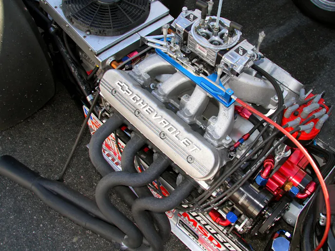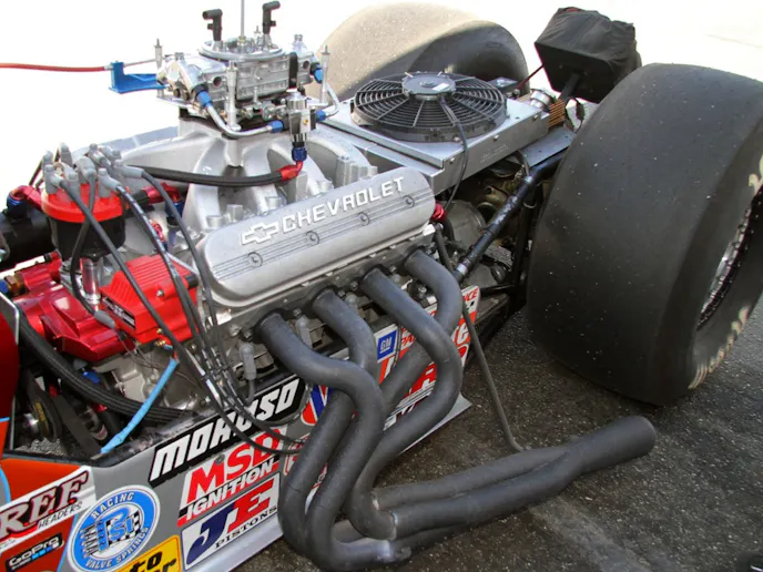 The foundation is a 6.0-liter block equipped with a Lunati crankshaft and rods. The pistons are off-the-shelf units from Wiseco that provide a 13.5:1 compression ratio. Comp Cams supplies the cam and 5/16-inch pushrods while factory lifters handle the heavy lifting. The stock oil pump wouldn’t work, so an external single-stage Aviaid pump is driven by the crank. Five quarts of oil reside inside a Williams pan with a stepped sump designed to fit the dragster frame rails.