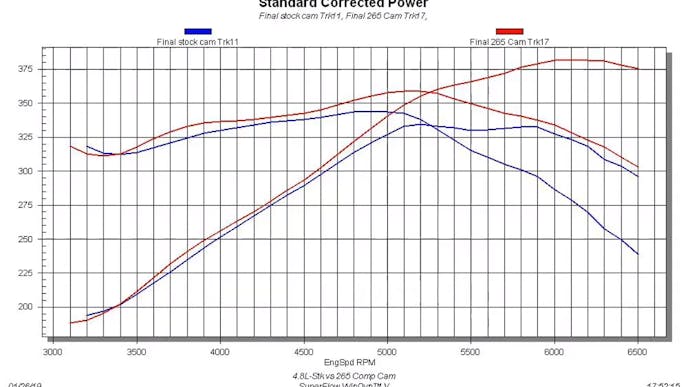 After installing just the camshaft, Holdener spun the 293 ci mill to 6,500 RPM on the dyno. With just the cam swap, peak power jumped to 382 horsepower and 359 lb-ft of torque. While a 47 horsepower and 15 lb-ft peak gain is impressive, the really impressive part is the huge amount of increase under the curve from about 5,000 rpm onward.