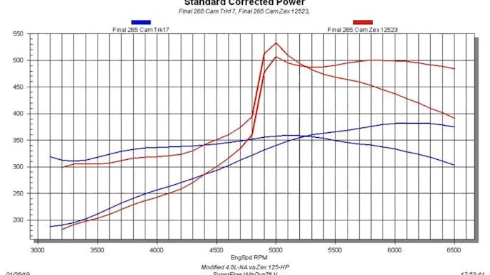 For upgrades, Holdener kept it simple and affordable, limiting it to just a cam swap and a Zex wet nitrous kit. For the camshaft, Holdener chose a Comp XFI RPM hydraulic roller camshaft (P/N: XR265HR). Labeled as “good torque and very strong mid-range power”, the XR265HR cam profile is designed to operate in the 1,200-6,000 rpm range, with .522 inch of lift on the intake and .529 inch on the exhaust, with 212 degrees of duration at .050 on the intake and 218 degrees on the exhaust side, with a 114-degree lobe separation angle.