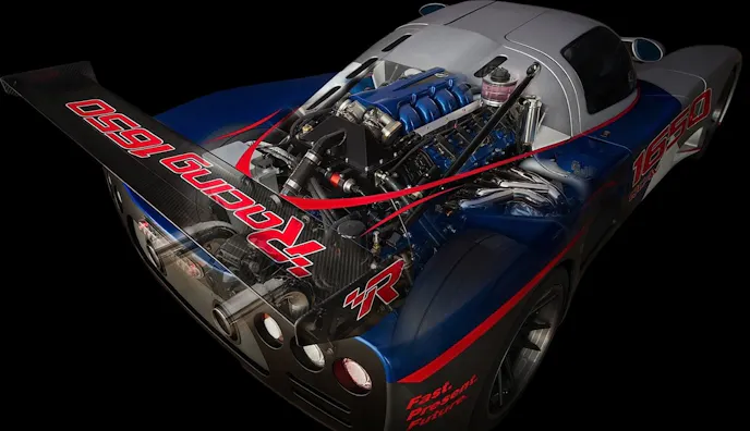 Different views of how the Mercury Racing QC4v was packaged into an Ultima kit car.