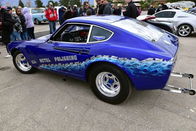 We stumbled upon this completely customized 1973 Datsun drag car. Almost everyone single part of this car has been customized to include the nitrous assisted big-block Chevy, stuffed between the frame rails.