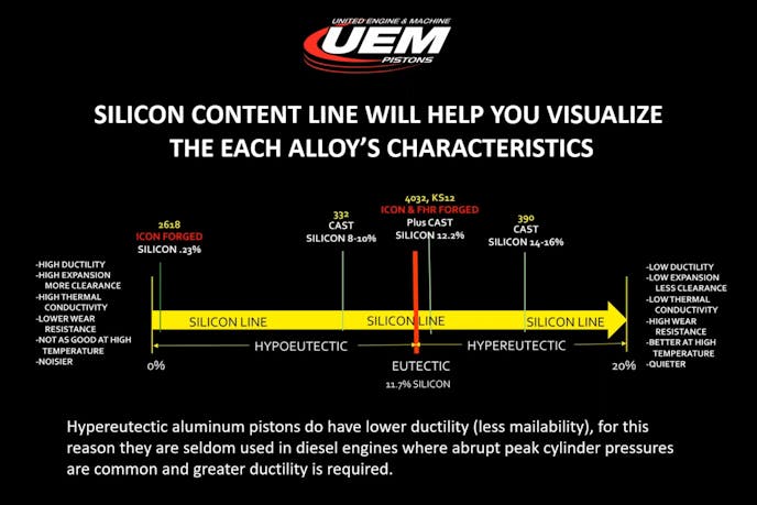 You might have heard the term “eutectic” in some form in reference to pistons. To make it simple, hypereutectic basically means the alloy has a high percentage of silicon — up to 20-percent. Hypoeutectic means the opposite, as there is very little silicon in the alloy, and eutectic is the middle point, at about 12.2-percent silicon content in the alloy.