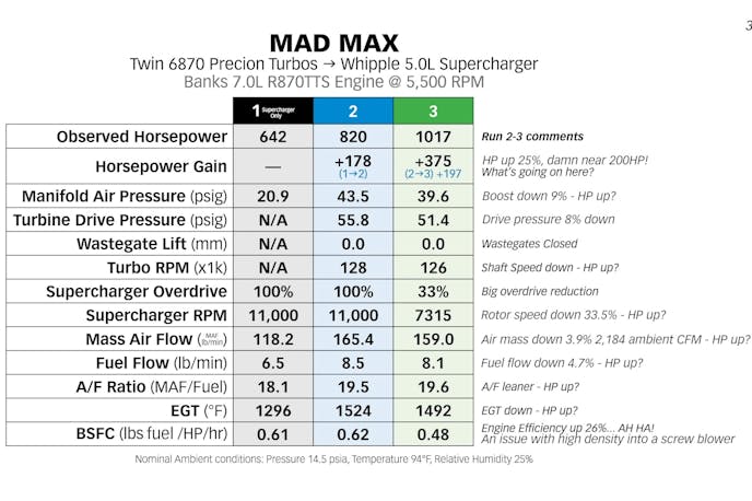 “What’s really cool is that BSFC went from a 0.620 all the way down to 0.480,” Banks says. That’s an engine efficiency increase of 26-percent. A-ha!” From these numbers, Banks surmises that there is an issue with shoving heavily compressed air into a screw-type supercharger. “I bet no one saw that one coming, because I sure as hell didn’t” laughs Banks.
