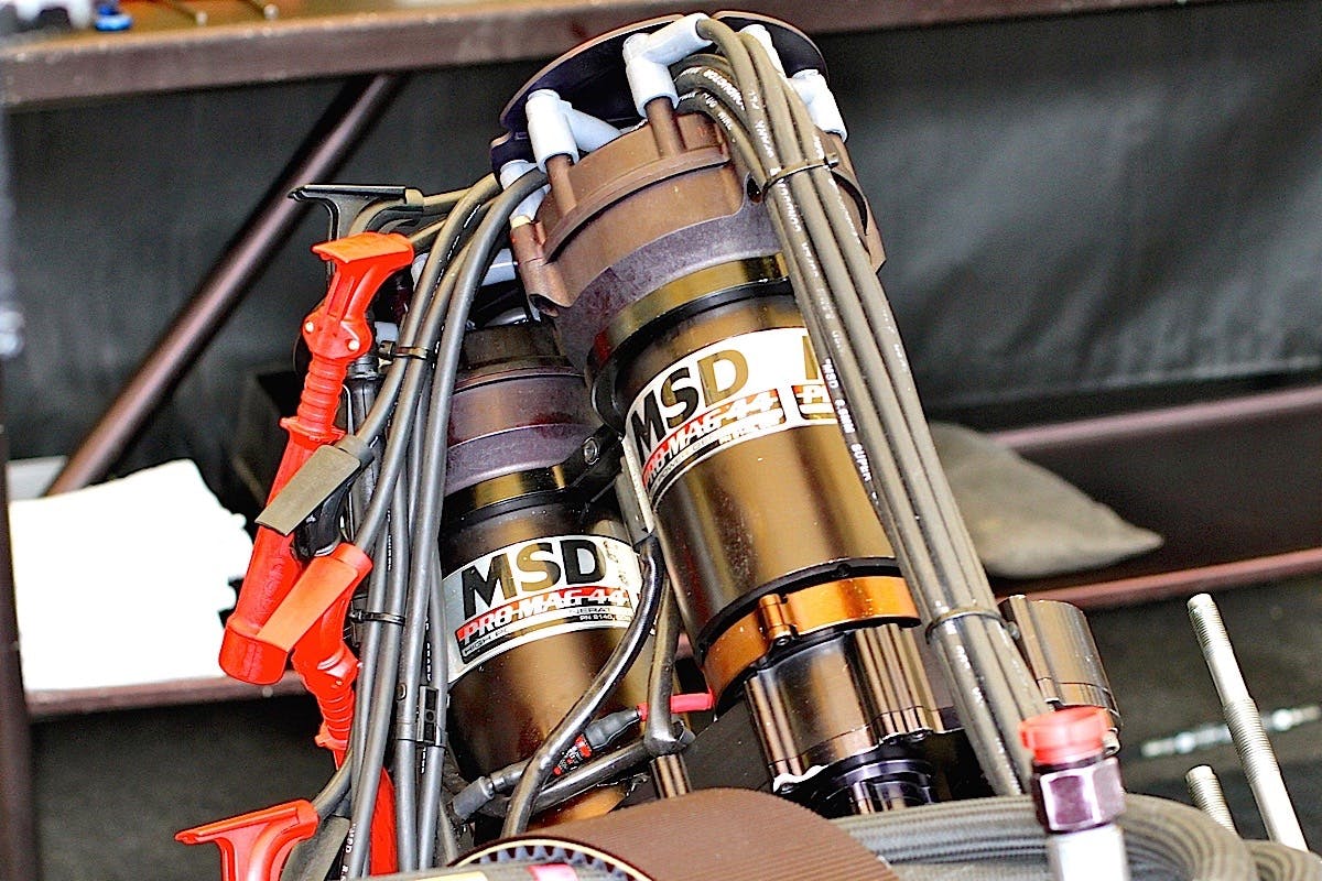 Two MSD Pro Mag 44-amp magnetos provide spark to 16 plugs on a Top Fuel engine.
