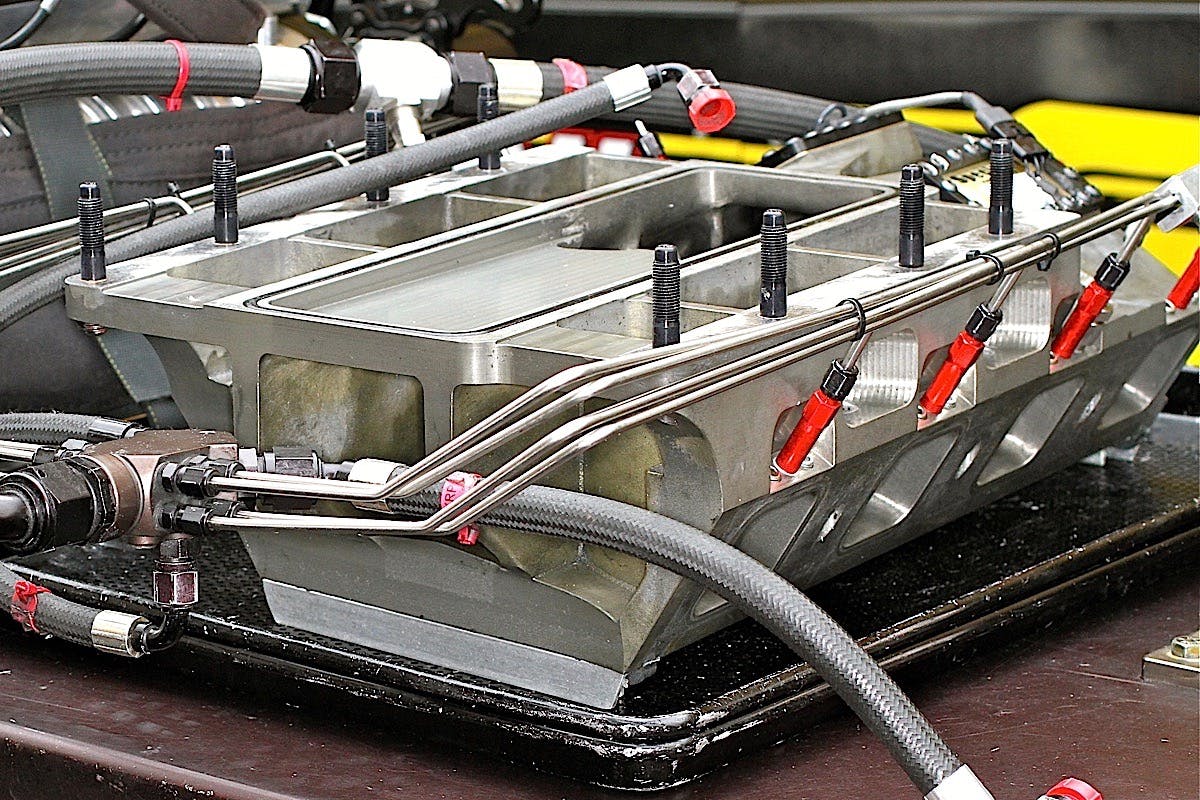 Nitro engines are limited to 500 ci and the blocks must be machined from forgings; no cast blocks allowed. The billet cylinder heads feature two injection nozzles per cylinder that are directed into the port right behind the intake valve. Overall there are 34 fuel-injection nozzles on a Top Fuel engine -- 16 in the head, 8 in the manifold and 10 in the blower hat.