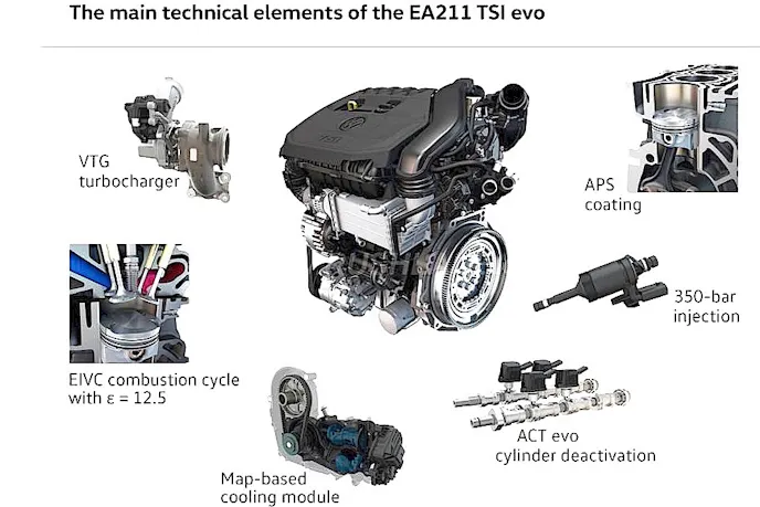 The VW EA211 turbo engine may help draw attention away from the automaker’s diesel mess. This new gas engine uses variable-geometry turboharging–which is rare in mass-market gas engines–, advanced direct injection and a high 12.5:1 compression ratio. It can also deactivate two cylinders for economy cruising. But the major effort is adapting aspects of the Miller cycle, which involves manipulating the intake valve opening and closing.