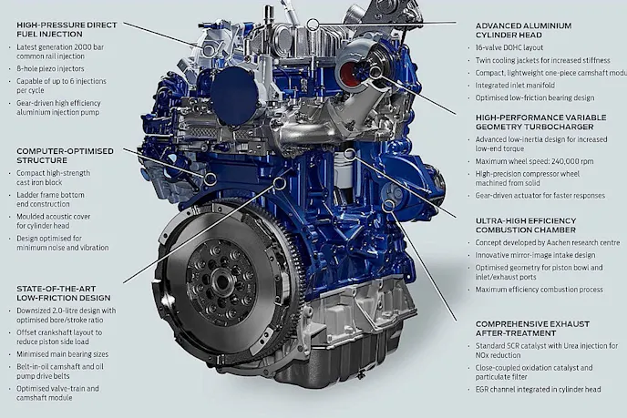 The Ford EcoBlue utilizes an offset crank (.39-inch or 10 mm) to help reduce piston side-loading, which cuts down on parasitic losses. Engineers also came up with a unique porting system in the inlet manifold that generates a clockwise airflow pattern for two cylinders and a mirror-image reverse pattern for the other two cylinders. The object is to evenly distribute air to the cylinders before fuel is injected. The fuel system is also upgraded to allow for up to six injections per cycle. There’s also a redesigned turbocharger that spins up to 240,000 rpm.