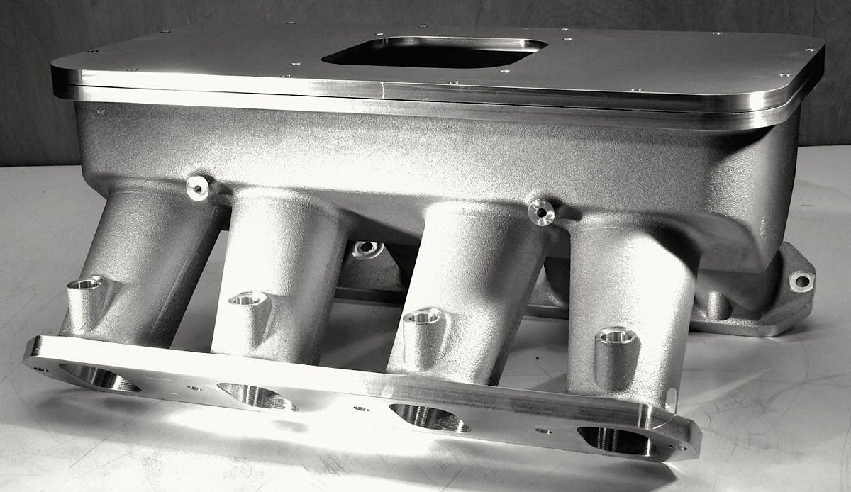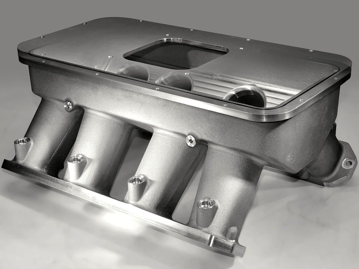 The intake is cast from 355 T6 alloy and features O-ring sealing between the plenum and top plate. Precise CNC machining ensures equal runner lengths and consistent radius at the runner entrance. It’s designed for a standard 9.240-inch deck height and comes with fuel-injector mounting provisions as well as a dedicated fuel rail with -8 AN fittings.