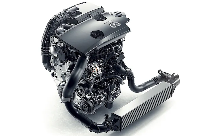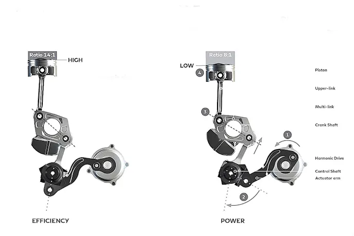 The strategy is provide a low compression ratio while under power and full boost. But when the engine is at low rpm and the turbos are not pressurizing the cylinder, the engine is very inefficient due to the low compression ratio. Under low load conditions and 14:1 compression ratio, the engine will act more like an efficient non-boosted engine. But when the driver asks for more power and turbos spool up, then the compression ratio drops, allowing the turbos to do their job more efficiently and without the detonation potential of a high compression ratio. Infiniti says sophisticated engine controls manage the compression ratio seamlessly, depending on the driving conditions. In addition to better fuel economy, Infiniti says there is reduced noise and vibration levels and the engine comes in a tighter package.