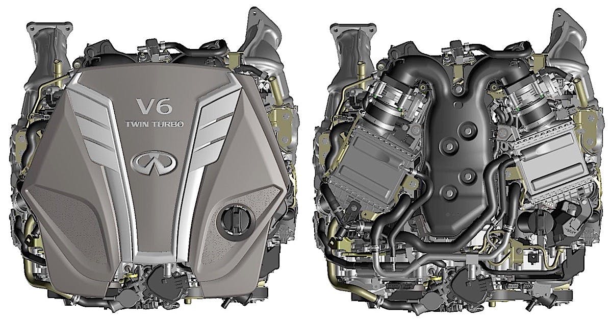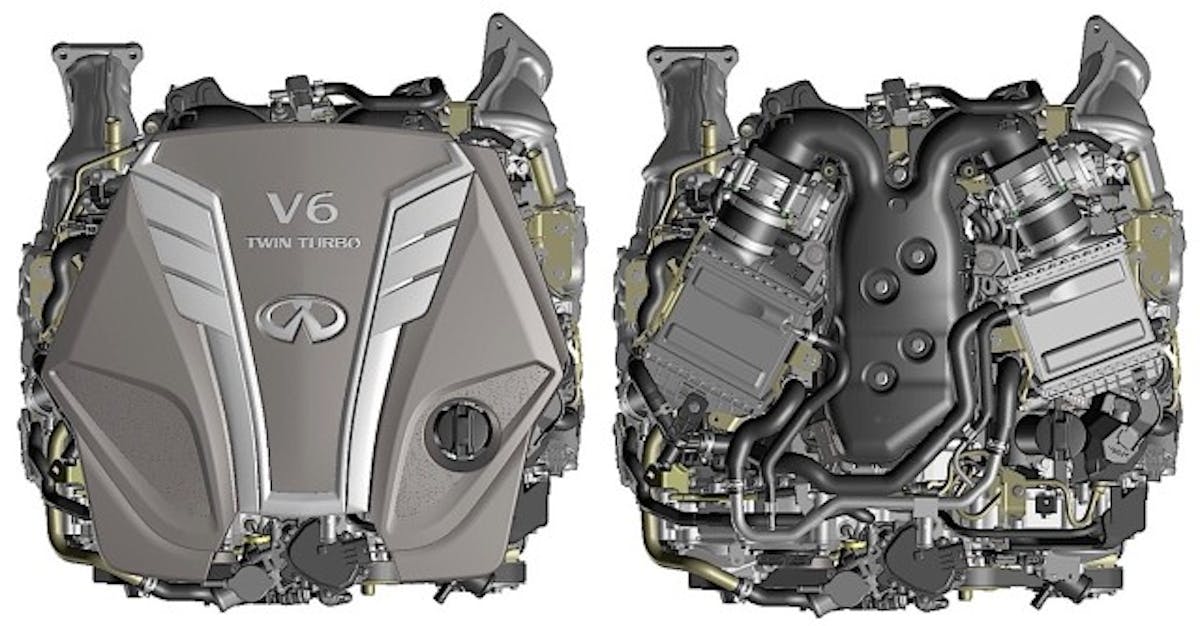 The cylinder heads were designed with integrated exhaust manifolds so that the turbos bolt right up, resulting in a shorter path for the exhaust gasses to hit the turbos and catalytic converters. Other tricks include variable valve timing controlled with an electric motor on the intake valves (the exhaust valves are handled with a more conventional hydraulic phaser) and water-cooled intercoolers mounted on top of the engine. Even with the improved power, Infiniti says fuel efficiency improves 6.7 percent. The engine will be manufactured in Iwaki, Fukushima.