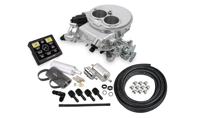 The Sniper EFI 2-barrel system puts an end to cold-start issues, hesitation, vapor lock, and flooding. A Master Kit is available that includes everything for a complete fuel system – 20 feet of 3/8-inch Earl’s Vapor Guard fuel hose, an 80 GPH in-line universal electric fuel pump (part number 12-920), fuel filters, all the necessary hardware, and a bulkhead fitting to return fuel into the tank.
