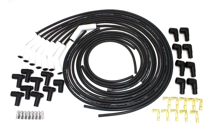 The wires have two layers of heat protection with an 8mm pure silicone outer layer and an insulated core capable of withstanding temperatures up to 600 degrees Fahrenheit. They also have spiral wound stainless steel alloy wrapped around a fiberglass core. Other features include a low 500 ohm per foot resistance rating for better energy delivery, stainless steel spark plug and HEI terminals, and solid brass distributor terminals. Available in universal V8 sets with straight, 45, or 90 degree boots.