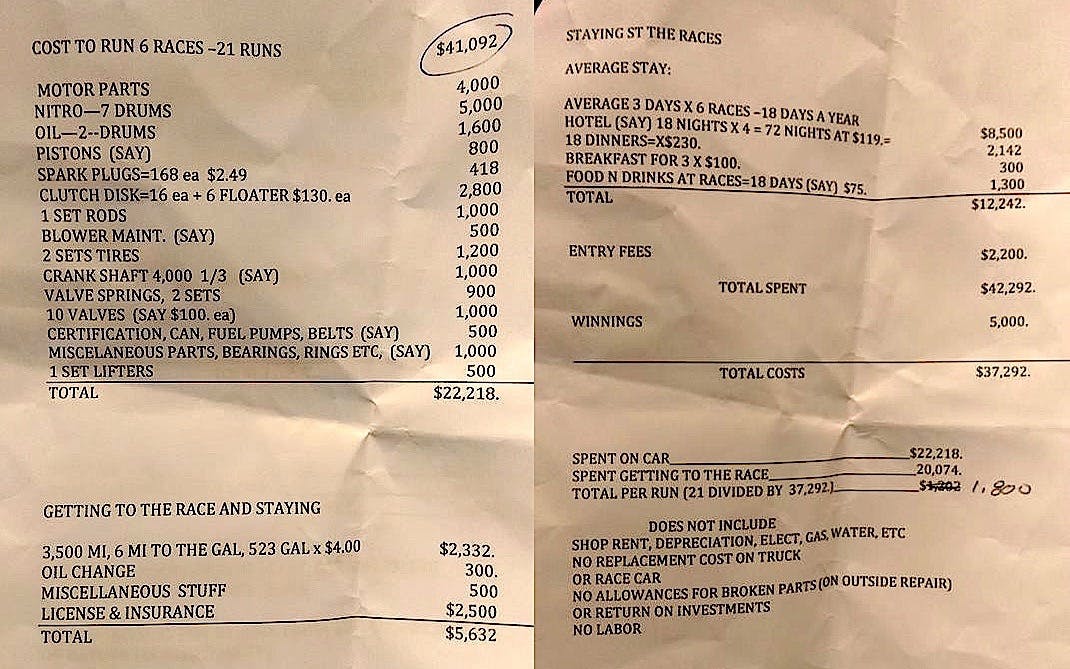 The remainder was needed just to get to the track. Subtract $5,000 in winnings, and math breaks down to just under $1,800 every time his driver took a green light.