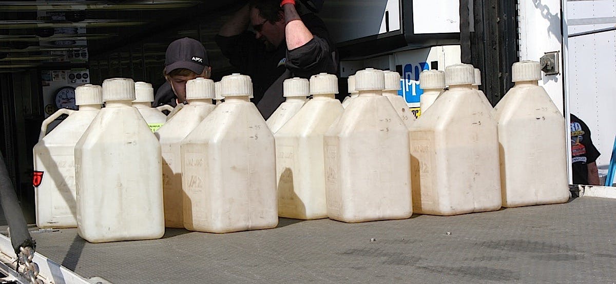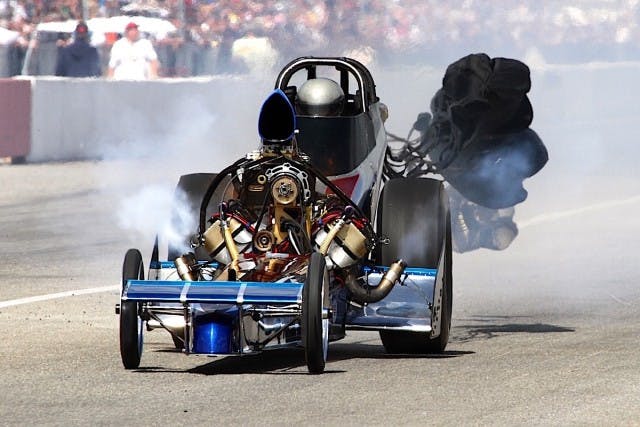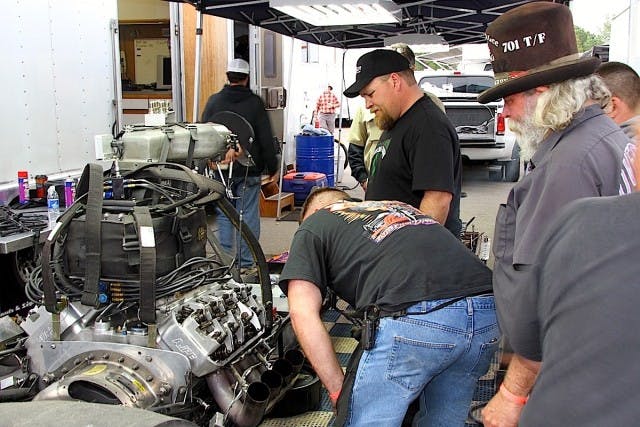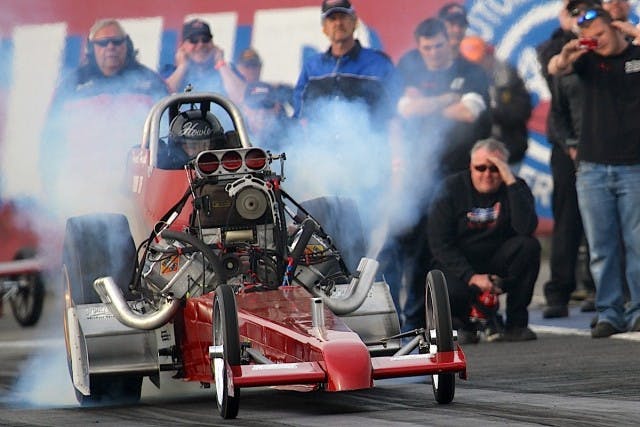 But all joking aside, it takes a crew of eight to get a nostalgia dragster through a weekend. (For more on this sport, check out aafd.tv.) From the start, a full run with warmup, burnout and race will consume 10 to 11 gallons of nitro, which now costs $850 a drum. Every run also chews up eight spark plugs and contaminates 14 quarts of oil. Just like in NHRA Top Fuel, the engines are disassembled after the race and crucial components are swapped in. Fuller will install freshened pistons and rods after each run and check vital components. The previous pistons and rods will be checked and reconditioned as needed before going back in another time. A crankshaft can last about 50 runs, says Fuller, so he prorated that cost over a season at $1,000. A new set of aluminum rods is $1,000, and a new set of pistons is $800. Fuller made it through the season with only two sets of valve springs.