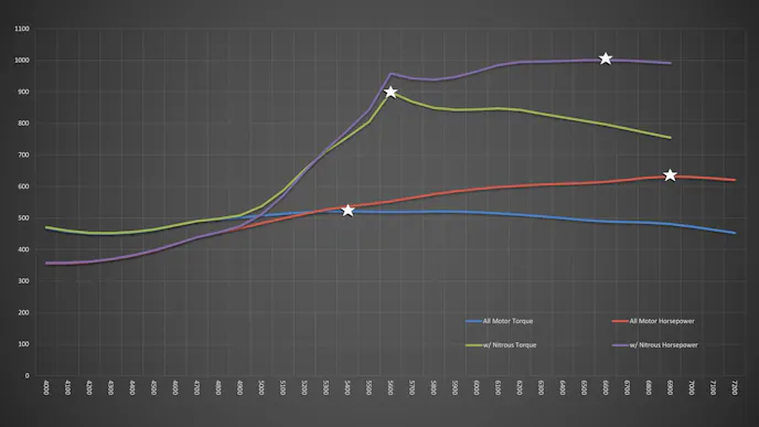 Before spraying the engine, the Prestige Motorsports team made a couple of naturally aspirated dyno pulls to get a baseline number. For the N/A pulls, the run was started at 4,000 rpm and stopped at 7,200 rpm. The peak all-motor horsepower was 631.7 horsepower at 6,900 rpm and peak torque of 521.9 lb-ft at 5,400 rpm.