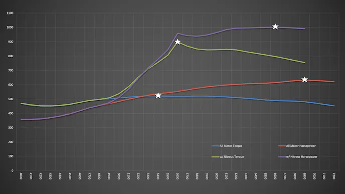 After some quick nitrous tuning, the ramp built in the Terminator’s controller started with 25-percent nitrous activation at 5,000 rpm, and then steadily ramping up to a peak of 75-percent at 6,000 rpm, and holds there for the duration of the run. That ramp provided a peak power number of 1,001.2 horsepower at 6,600 rpm and peak torque came it at 5,600 rpm, measuring 898.6 lb-ft. And the best part about those numbers, is that there is still another 25-percent left with the currently installed .073 jets. So even more power is just a few keystrokes away.