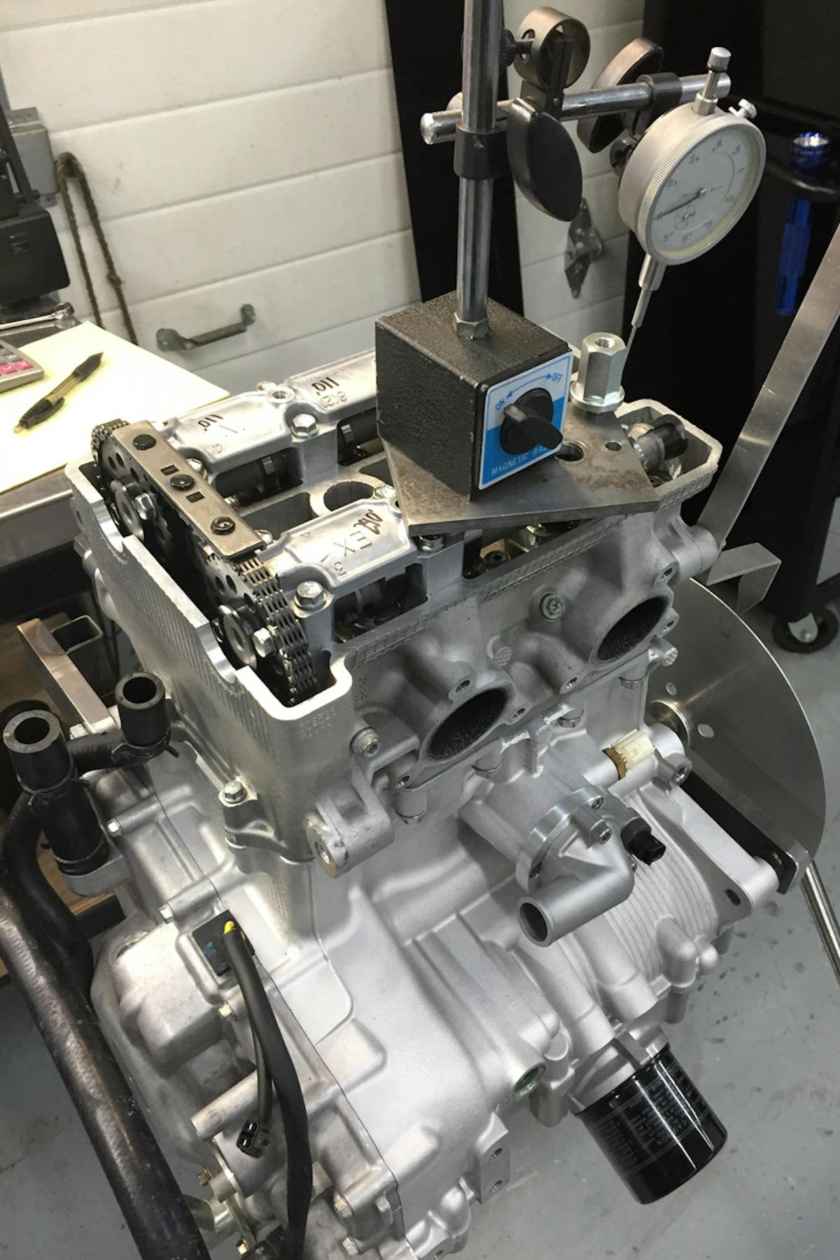 “This engine was manufactured by Suzuki for Artic Cat, and the unique thing about this engine is that it’s a two-cylinder, even-fire four-stroke and has four valves per cylinder — it’s very similar to the Hayabusa platform,” says Campton. “It looks like you took the center two cylinders out of a Hayabusa cylinder head, put it back together, then increased the size by 30 percent. The engine was originally designed back in 2006 as a naturally-aspirated engine; they knew which direction they were going, and it’s manufactured in such a way that the rod and main pin dimensions were very large and robust compared to a normal engine of this displacement.”