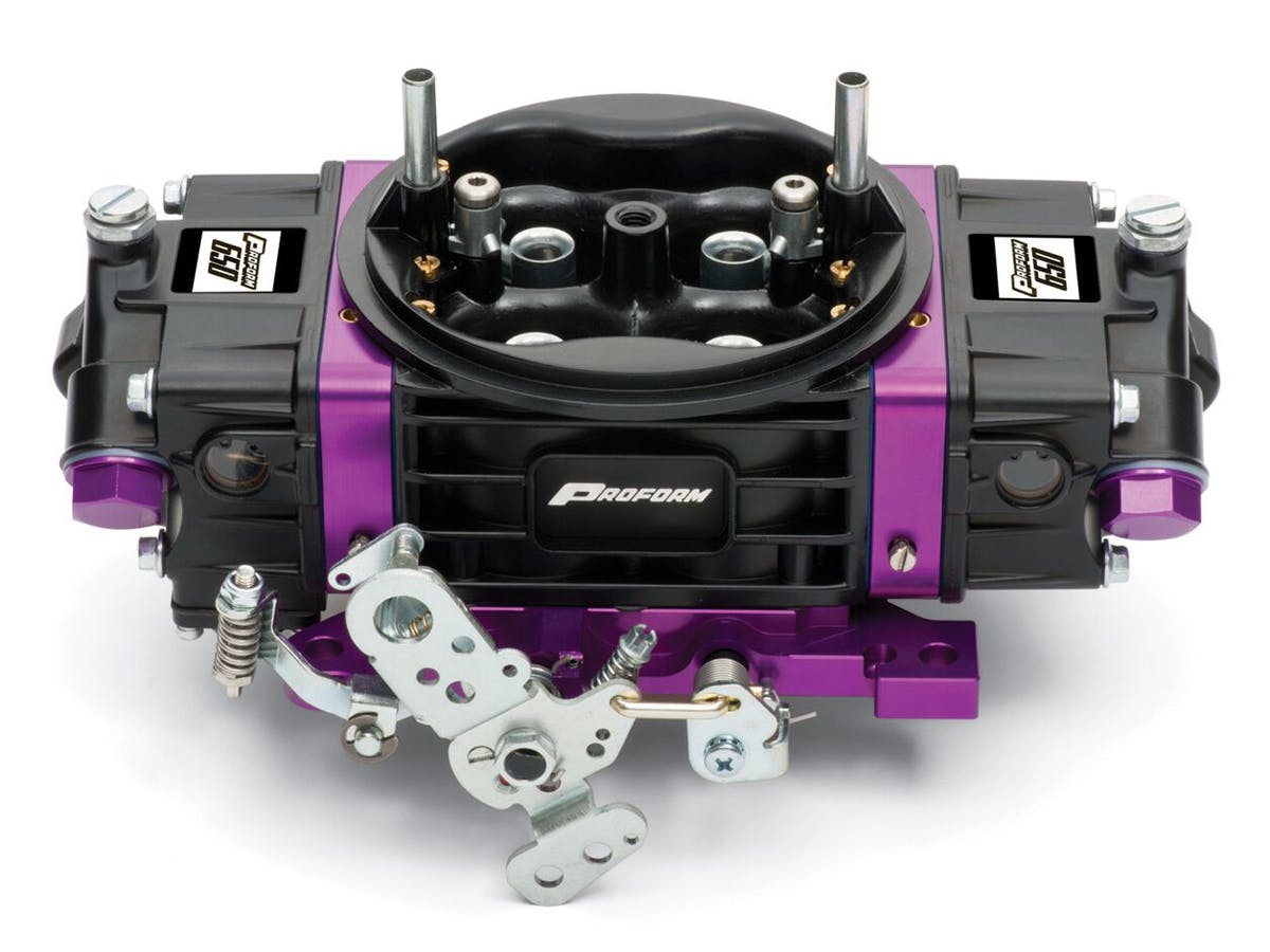New four-barrel carburetors from Proform feature a Black Diamond PTFE coating on the main bodies and fuel bowls. During testing, this coating reduced fuel temperature by up to six percent, combatting vapor lock. New carburetor models — all with mechanical secondaries — range from 650 to 850 cfm in Street Series and 650 to 1050 cfm in Race Series (no air horn, choke tower/choke control for maximum flow). Standard features on all Black Series Proform carburetors include billet metering blocks and baseplates, lightweight aluminum fuel bowls and main bodies, adjustable air and fuel settings for precision tuning, and compatibility with popular Detroit Three automatic transmission kickdowns. Each carburetor is hand-assembled in the USA and engine-tested prior to shipping.