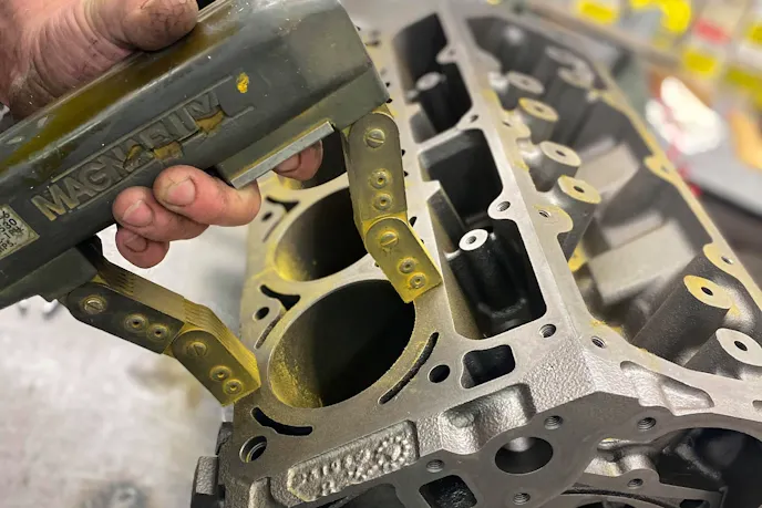 If you’ve been around engine building for any length of time, you’ve probably heard about components — usually blocks, connecting rods, and cylinder heads — being “Magnafluxed,” “mag checked,” or simply “magged.” You’ll notice that “Magnaflux” is capitalized, because that is a proper noun — it’s a brand name. Much like how “Kleenex,” “Q-Tip,” or “Thermos” have become eponyms to describe the items, rather than just a brand, Magnaflux has done the same for automotive magnetic particle inspection.
