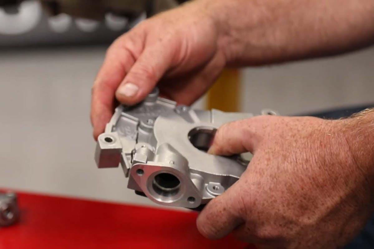 After adding some oil into the pump and rotating the pump a bit, the trick is to line up the flats of the crankshaft with the drive flats on the inside of the gerotor of the pump. “By getting those to a point where you know they will line up with the flats on the crank makes the process easier,” Risinger says. Once the pump is fully engaged, you’ll be able to see part of the crankshaft’s step protruding from the front of the pump and there will be no lateral wobble of the pump.