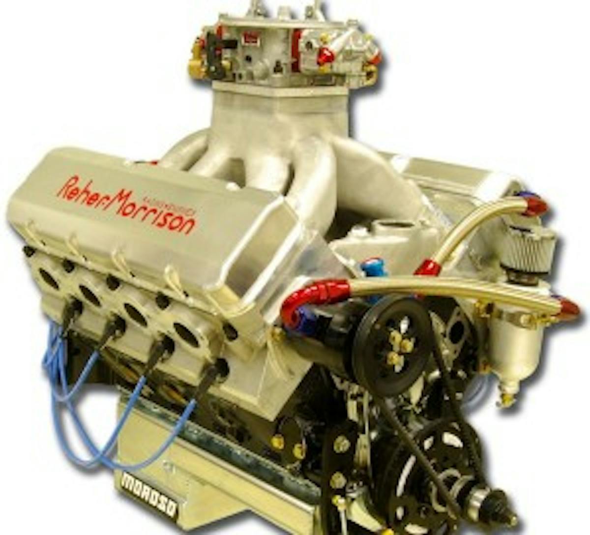 Reher-Morrison supplies the RMRE Raptor 12-degree cylinder heads that sport Manley titanium valves, T&D shaft-mounted rockers and PAC springs. Pulling vacuum from the RMRE/Moroso billet valve covers is a Moroso pump that is monitored with a Star Machine regulator. A Gary Williams carb is mounted on a RMRE anti-reversion plat and Edelbrock intake manifold. Additional components include MSD ignition, Akerly & Childs bearings, BHJ lifter-bore sleeves, XRP plumbing and gaskets from Cometic, Fel-Pro and Mr. Gasket.