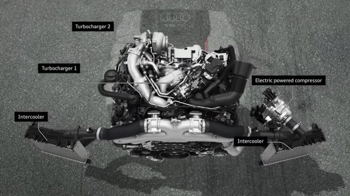 In the video above, the system is shown through slick animations, while in the video below, Jason Fenske of Engineering Explained does a great job of breaking down Audi’s intensely complicated system that involves a heap of electrical components, three separate compressors, and a cutting-edge cam and valvetrain system that revolutionizes how exhaust is fed to the two traditional turbochargers in the system.