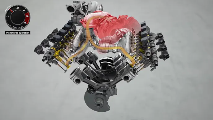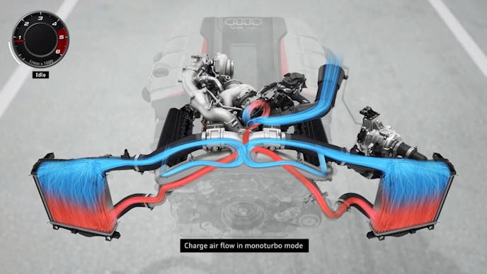 The exhaust gasses are filtered through only the single turbocharger at idle through the ingenious Audi Valvetrain System, which only activates a single exhaust valve at idle and the low-to-mid RPM range.