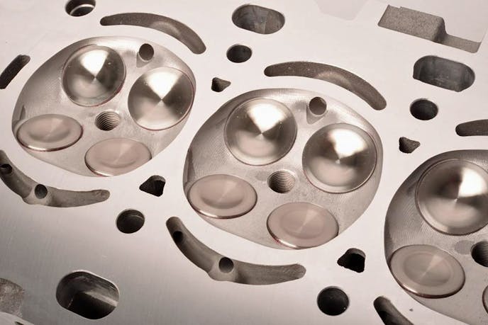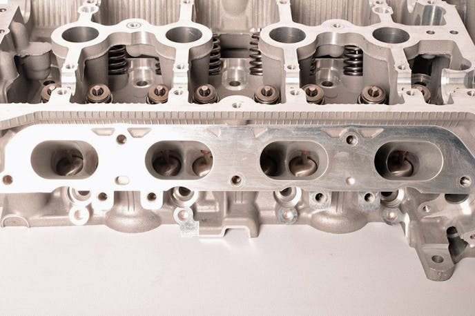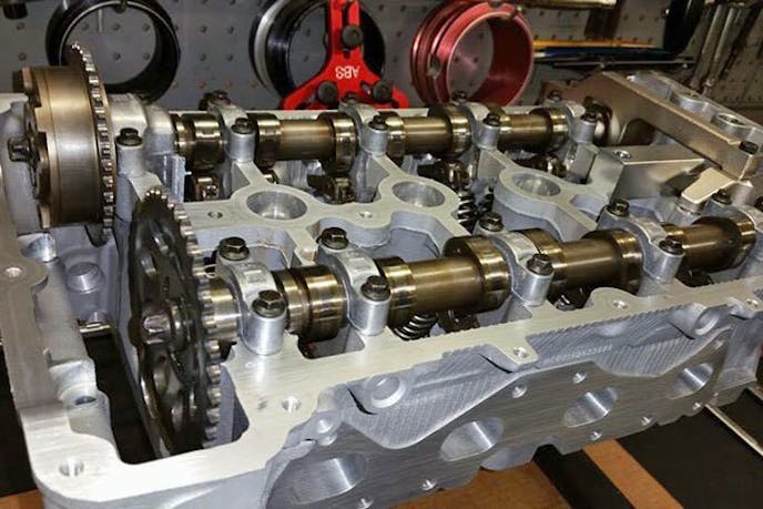 But the top end of this N14 Mini Cooper engine is where the build really shines. Brueggemann completely reworked the cylinder head; CNC porting worked wonders on the casting. Flow is increased at .500-inch lift from 143.3 cfm to 206.3 cfm for a 31-percent flow increase. On the exhaust side, flow was increased from 147.7 cfm, to 171.7 cfm for a 14-percent increase. The combustion chamber is then cleaned up on the 5-axis CNC before Supertech Manganese-Bronze valve guides are fitted. Supertech stainless intake valves, and sodium-filled Inconel exhaust valves are used. The valvetrain remains mostyl stock, with the exception of Supertech beehive valve springs and Supertech titanium retainers.