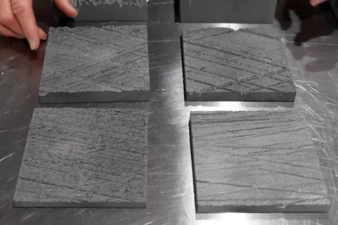 Similar to a record player, a profilometer uses a two-micron diamond needle to follow the surface, measuring how it moves up and down on the surface to create a profile. For reference, a human hair is about 80 microns. This is good, but Malburg uses a 3D optical measuring system that can create a 3D representation of the surface finish, which is more accurate. In the video, Malburg shows some scaled-up versions of cylinder wall and ring textures in 3D printed form. When scaled up, you can see that several of them look like rough concrete, but that’s only part of the story.