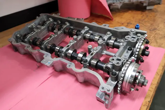 Interestingly enough, the camshafts come out of the engine as an entire assembly, using a unique “girdle” unit, which adds rigidity, per Papadakis. Then, we see the aftermarket solid lifters which replaced the OEM hydraulic units, and the shims used to adjust the valves, as he removes the custom shaft rocker setup from the cylinder head.