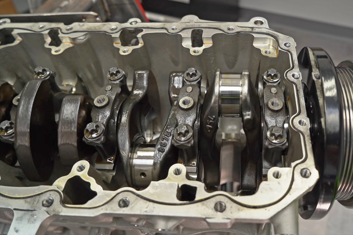 Moving to the rotating assembly, the forged steel connecting rods feature a cracked-cap design and coated rod bearings straight from the factory. The pistons are a unique shape, ostensibly to help save weight while maintaining strength and stability in the bore, and feature both a full floating wrist pin, and an anti-friction skirt coating on them.