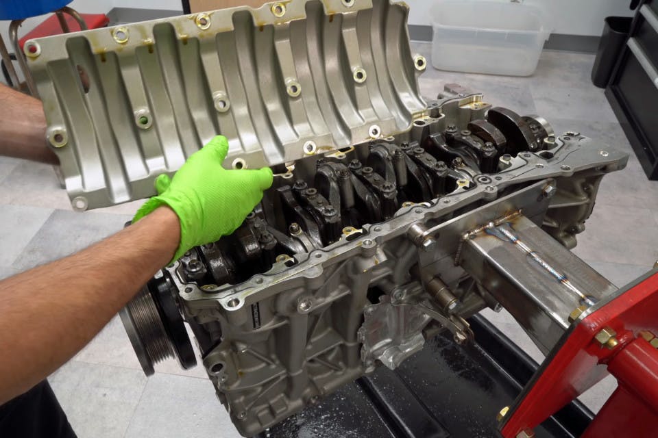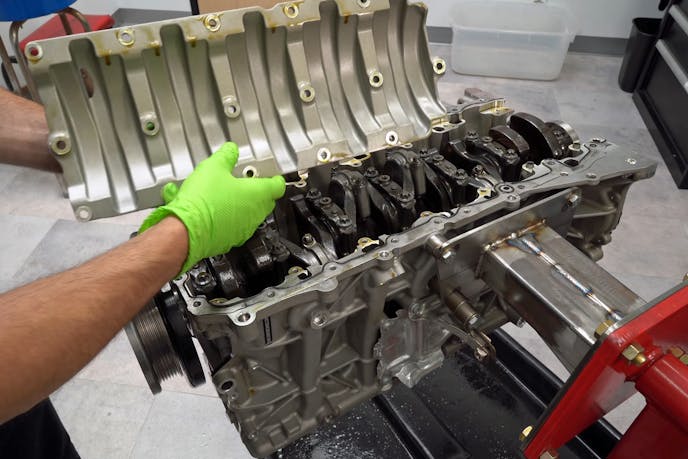 Flipping the block over, we find a solid cast-aluminum oil pan with an oil level sensor built-in. “There are no gaskets used on the oil pan, just sealer,” explains Papadakis. “In fact, there are very few gaskets used anywhere in this engine.”