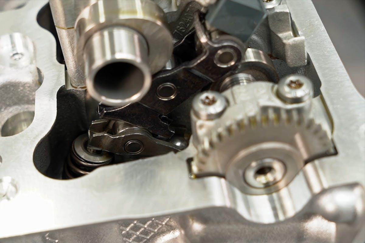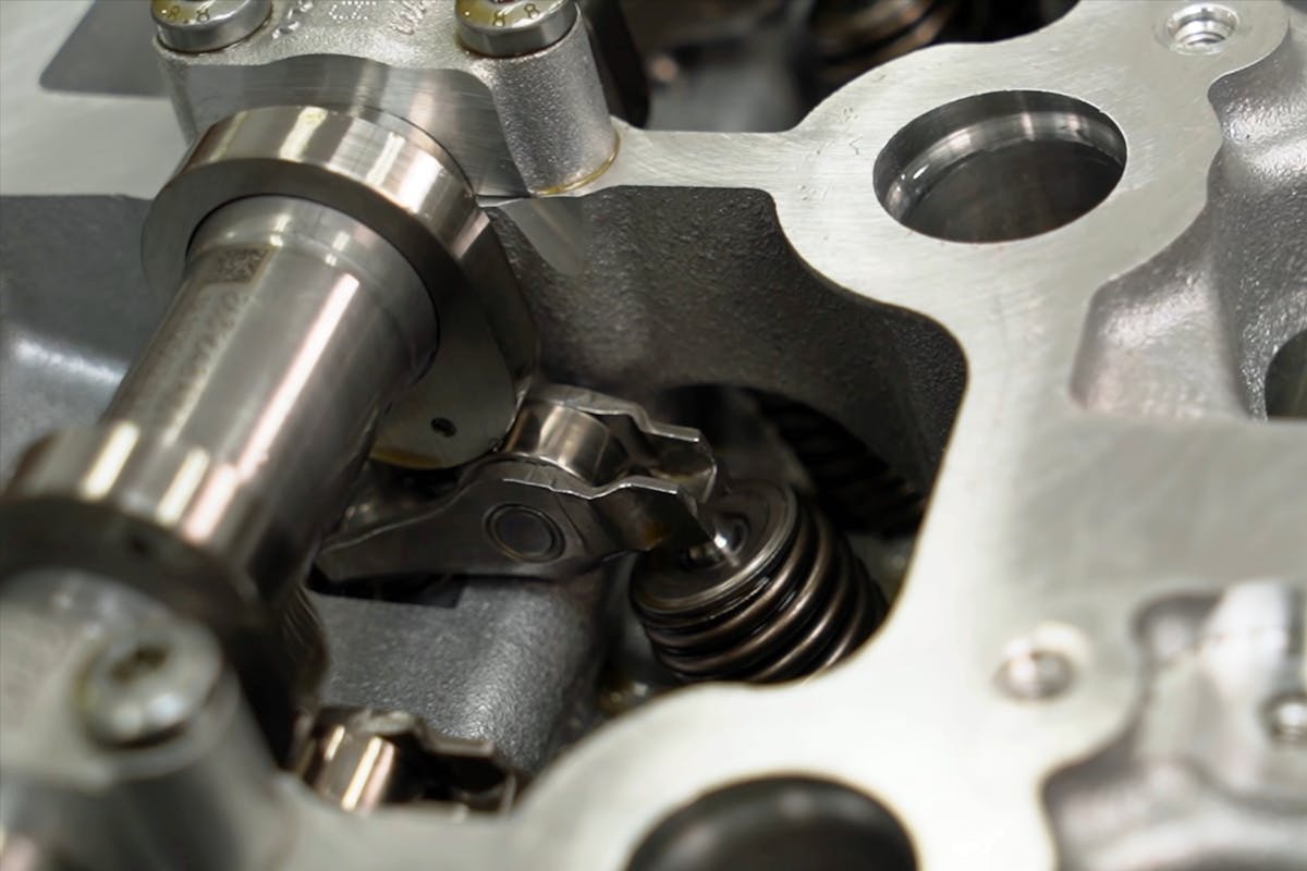 However, the intake cam’s valvetrain is more complex, incorporating variable valve lift, as well. There are two separate rocker arms, and an eccentric to change the rocker ratio through geometry,” Papadakis explains. The second rocker arm’s geometry is altered by mechanical rotation of the eccentric, which itself is controlled by the ECU based on parameters such as RPM and load.