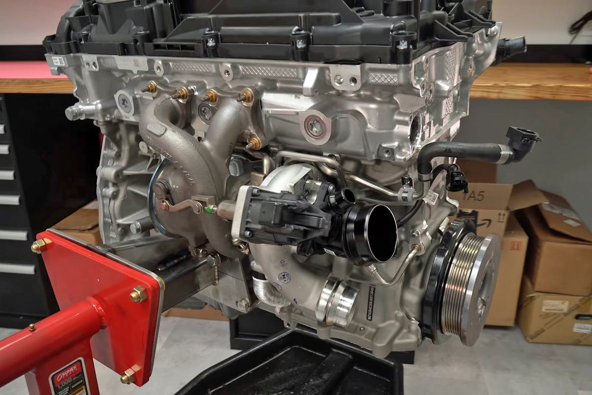 Moving to the intake manifold, like many modern vehicles, it is a composite material. However, this one does have an unusual twist. “The intake manifold is all plastic, and somehow they manufacture it with the intercooler core already inside of it. You can’t separate the two, they are bonded together,” Papadakis says. While that might be a neat OEM feature, that will hinder the ability of the aftermarket to make upgrades.