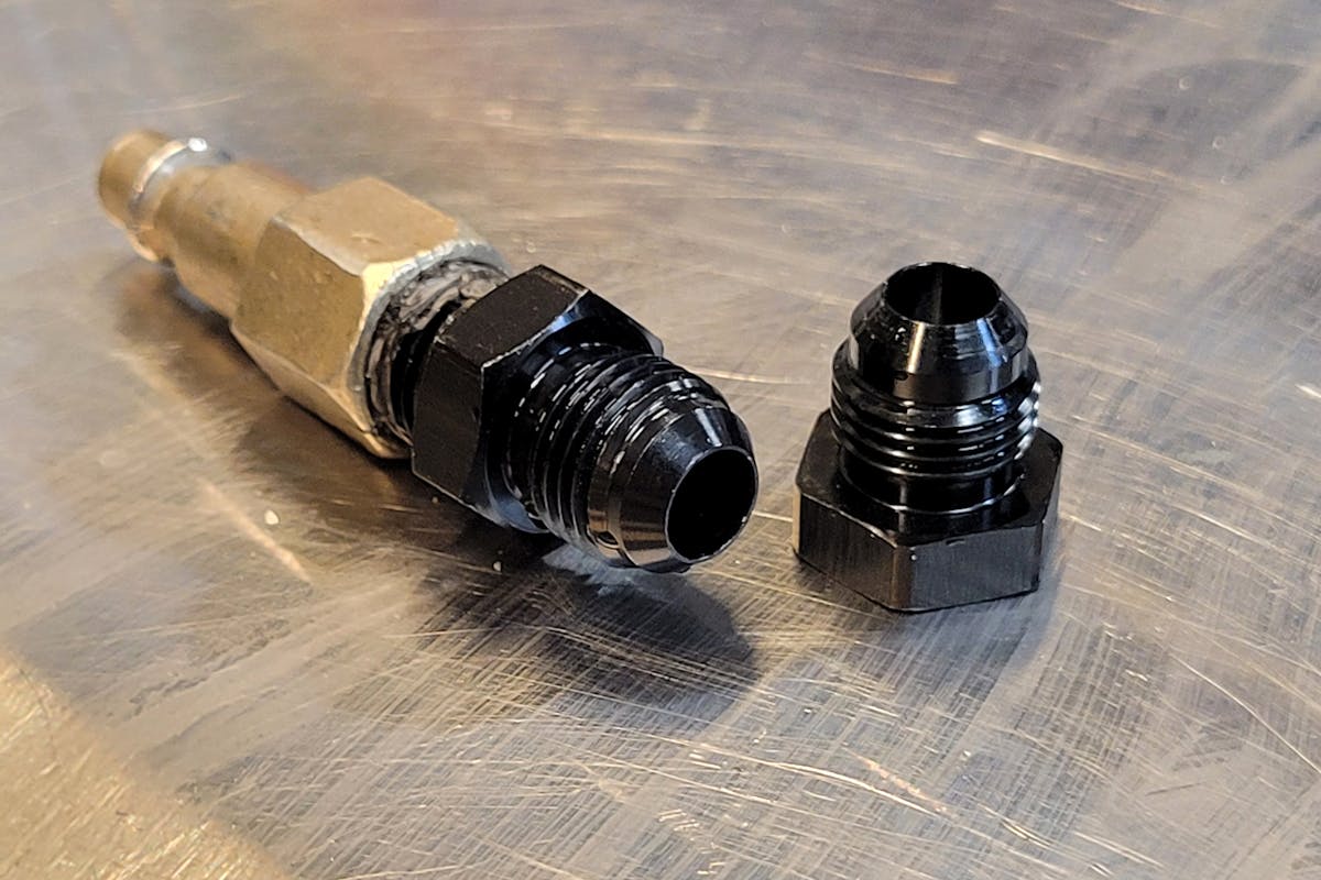 These are the only two specialty fittings you'll need to build an AN line pressure tester. From Summit Racing, these two fittings cost less than $10 combined. The quick disconnect air compressor fitting is available at pretty much any store that sells air compressor accessories.