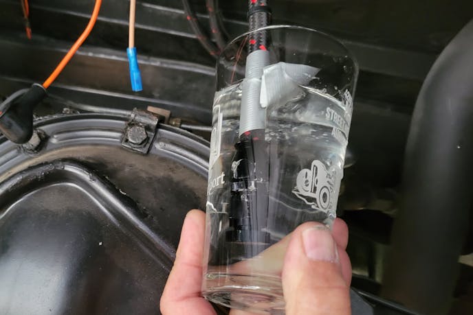 On the left, you can see the fitting being tested off of the car in a plastic tub of water on the floor of the shop. On the right, you can see us pressure testing already-installed lines in the car. In that case, a simple pub glass held up to the fitting works like a charm.